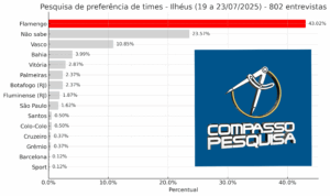 A mais recente pesquisa da Compasso Pesquisa em Ilhéus-BA revela muito mais do que números: mostra a alma do torcedor ilheense e sua relação histórica com o futebol. O Flamengo domina o cenário com 43,02%, resultado ainda maior que o registrado em Itabuna, confirmando um fenômeno que une raízes históricas, mídia e conquistas esportivas. Não é exagero dizer que Ilhéus já comporta, sim, uma loja oficial do Flamengo.